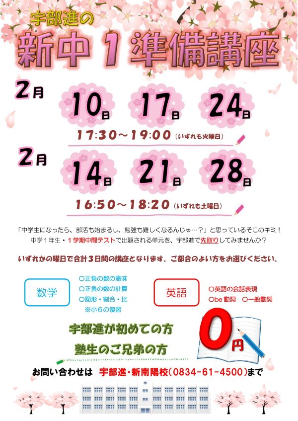 毎年好評!「宇部進の新中1準備講座」今年もやります🌸 「中学校からの勉強が不安…」「いつから始めれば間に合うの…?」といった 中学校生活に向けて不安になっている現小6のお子様・保護者様におすすめの講座です♪ お問い合わせは ▶▶▶ 新南陽校(0834-61-4500)まで!