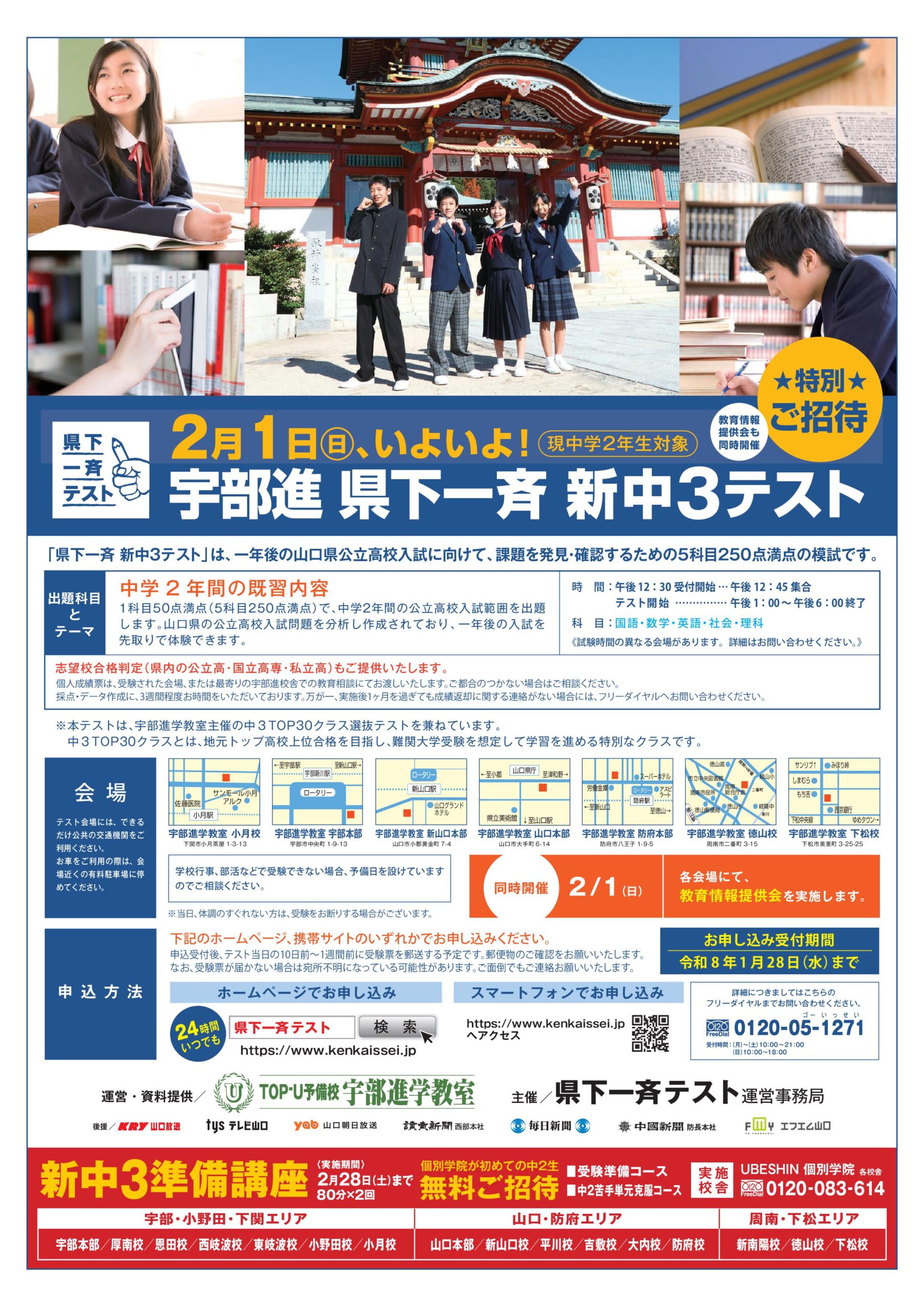 2月1日(日)、いよいよ!県下一斉新中3テスト 受付中